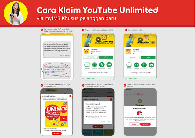 Untuk mendapatkan bonus tersebut, kita bisa melakukan dengan cara klaim bonus unlimited youtube. Dikarenakan bonus tersebut tidak bisa langsung aktif, sehingga anda harus mengklaimnya terlebih dahulu melalui aplikasi MyiM3 yang bisa anda download pada Google Playstore.
